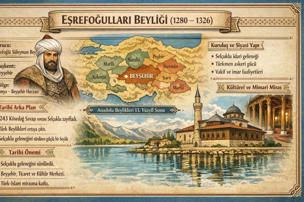 Bu bağlamda Konya ve Beyşehir havzasında hüküm süren Eşrefoğulları Beyliği, Anadolu’daki Türk siyasî devamlılığının önemli temsilcilerinden biri olarak dikkat çekmektedir. 13. yüzyılın sonlarında Eşrefoğlu Süleyman Bey (1280-1302) tarafından kurulan bu beylik, kısa süreli varlığına rağmen bölgede güç dengelerinde ve Anadolu’daki Türk-İslam kültürel mirasının korunması ile geliştirilmesinde önemli bir rol üstlenmiştir. Selçuklu siyasî ve idarî mirasının devamı niteliğindeki Eşrefoğulları Beyliği, Beyşehir merkezli bir siyasî yapılanma kurarak bölgenin ekonomik, kültürel ve sosyal gelişimine katkıda bulunmuştur.