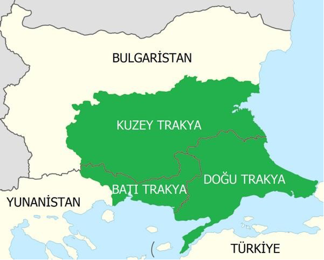 Şekil 1. Trakya olarak tanımlanan bölge üç ülke Türkiye (Doğu Trakya). Batı Trakya (Yunanistan) ve Kuzey Trakya (Bulgaristan) arasında bölünmüştür.