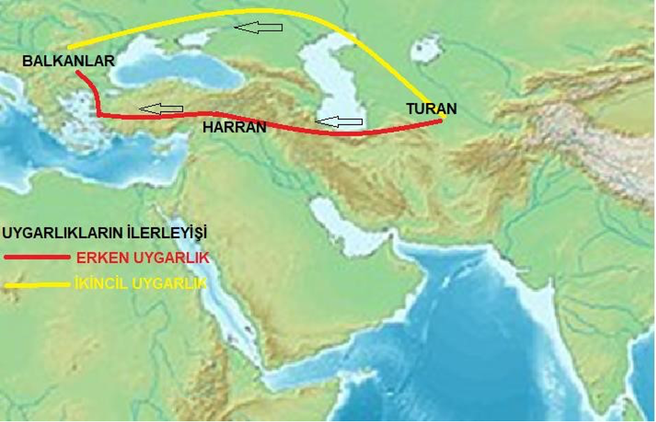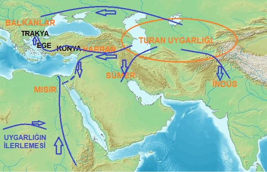 Batıda ise, Uygarlık Hazar Denizi çevresinden başlayarak ARAN ülkesi ve URMU’ya (Güneybatı İran; güney Azerbaycan) ulaşmıştır. ARYAN uygarlığının kökeni de büyük bir olasılıkla budur (Childe, 1926). Buradan da Toros ve Zağros Dağlarındaki geçitlerden ilerleyerek, dünyanın ilk uygarlığının (yaklaşık 12 bin yıl önce) oluştuğu Harran Ovasına ulaşılmıştır. Buzul çağı sonunda Harran bölgesi en uygun iklim koşulları ve coğrafyaya sahipti. Dünya uygarlığında asıl sıçrama, bundan 5-6 bin yıl önceki sıcak iklim koşullarında buzulların hızla erimesi ve deniz seviyesinin hızla yükselmesi sonucunda deltaların oluşmasından sonradır. Sümer uygarlığı da Turan, Aran ve Harran’dan güneye ve batıya doğru Mezopotamya’ya ilerlemiştir. Ayrıca Harran uygarlığı Torosları aşarak önce Konya Ovası’na (MÖ 8000) ve batıya doğru ilerleyerek Ege Denizi kıyısında Troya uygarlığını (MÖ 4000) meydana getirmişlerdir. Uygarlık buradan batıya Trakya’ya geçmiş ve Avrupa uygarlığının temelleri atılmıştır (Şekil 6).