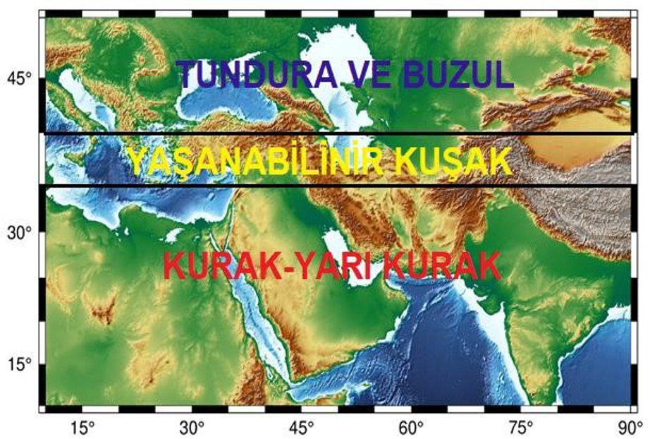 Son Buzul çağı süresince (120 ile 12 bin yıl öncesi), dünyadaki sular genel olarak 40-45°N enlemlerinin kuzeyinde -kutup bölgelerinde- tutulmaktaydı. Ayrıca 30-35°N enlemlerinin güneyinden ekvatora kadar olan bölge yağış olmamasından dolayı (buzul çağları, dünyamızda kurak çağlardır) çok kurak ve çöllerle kaplıdır. Buzul çağlarında yaşama uygun bölgeler ekvator civarında dar bir alanda ve genel olarak 35-40° enlemleri arasındaki kuşakta var olabilmektedir. Buzul çağı sırasında, Güney Hazar Denizi yaşam koşullarının en uygun olduğu bir bölgede yer almaktadır (Ergün, 2021). Son Buzul Maksimumu (LGM) zamanında (20 bin yıl öncesi), Avrasya’nın büyük bölümü 40-45° K enlemlerinden sonrası buzul katmanları ile kaplanmıştı. Bunun yanında 30-35° K enlemlerinin güneyinde ise genel olarak hiçbir bitki örtüsü olmayan sert Kurak/Yarı Kurak iklim koşulları vardı (Şekil 3).