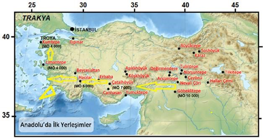 Uygarlık, buğdayın seyri ile beraber MÖ 7-8 bin sıralarında Konya düzlüğüne (o devirde göldü) Orta Anadolu’ya ilerlemiştir. Çatalhöyük ören alanı MÖ 7 bin yılını göstermektedir. MÖ 6 binde uygarlık göller yöresini aşarak Burdur-Denizli civarında Hacılar’a ulaşmıştır. Batıda Ege kıyılarına daha sonraki yıllarında erişmiştir (Şekil 8). Görüldüğü gibi ilk yerleşimler 35-40°K enlemleri arasıdır.