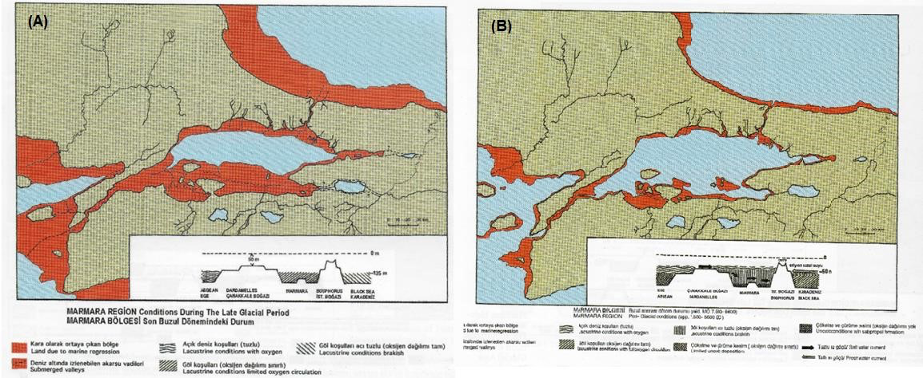 Şekil 9.(A) Buzul Çağı Maksimumu Dönemi’nde Marmara Havzası; (B) Erken Holosen Dönemde ılık tuzlu sular Çanakkale Boğazı’ndan gelen Marmara Havzası’nın durumu (Özdoğan, 2018’dan). (O devirde kara olan alanlar kırmızı ile gösterilmiştir).